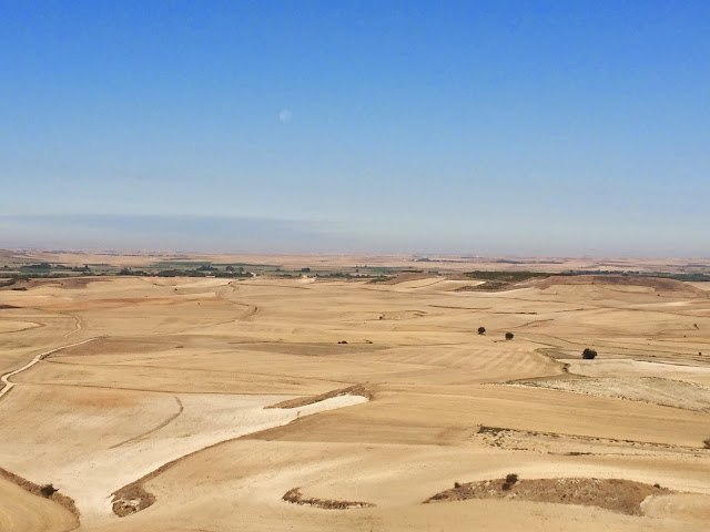 Etter nok en mil skulle vi over Alto de Mostelares. Det er ikke mye som minner om det flate landskapet jeg trodde mesetaen var. Strekningen er på litt over en kilometer med 12 prosent stigning. Jeg som i flere år har hatt problemer med bratte bakker gikk nå oppover i fint driv. Da vi var oppe på toppen ringte jeg mamma for å fortelle at vi hadde det strålende. Det var først da jeg fortalte om stigningen vi nettopp hadde unnagjort, og hun spurte om jeg ikke var sliten, at jeg forsto hvor god formen min nå var blitt.