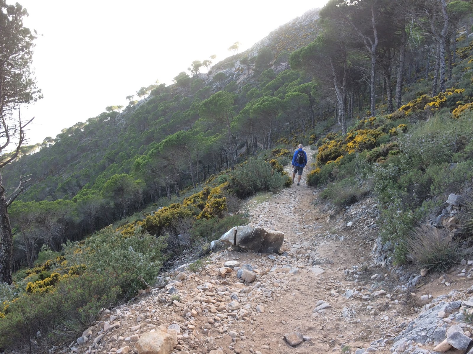 Så var vi endelig ved skiltet som viste at det var tid for å begynne nedstigninga til Mijas. Det var bare 1,3, km ifølge skiltet. I utgangspunktet en enkel strekning, men det skulle vise seg å bli ganske så utfordrende. Stien var bratt, det var mye stein, grus og klipper, og høydeskrekken min slo flere steder godt inn. Men det største problemet ble det vonde kneet. Nå var ikke smerten gryende lengre, den var nesten uutholdelig. Det var så godt som umulig å gå nedover når du nesten ikke greier å trø på foten. Vi brukte 1 time på 1,3 km, det sier vel sitt.