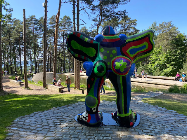 Niki de Saint Phalle sin "L´ouiseau Amoureux Fontaine" finner vi ved vannspeilet, den fargerike fuglelignende skapningen som sprer sine store vinger ut i lufta. Fuglens store kropp er omfavnet av en av Niki De Saínt ikoniske Nanas kjennetegn, en slags fruktbarhetsgudinne som symboliserer frihet og kjærlighet. I sommersesongen spruter skulpturen store vannstråler ut i luften fra vinger og hode. Informasjonene om parken har jeg funnet på Ekebergsparken sin nettside.